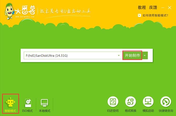 2、安装完成后双击运行,插入u盘,成功识别后采用默认的“智能模式”,直接点击“开始制作”,如有特殊需要可展开开始制作旁的下拉菜单进行设置,如图所示: