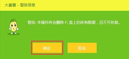 3、这时会弹出“本操作将会删除u盘上的所有数据”的提示,点击“确定”,如图所示: