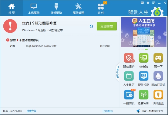 但并不能保证你的电脑声音正常,这时候需要打开驱动人生客户端,一键检测,可看到声卡驱动是否异常,如提示需修复,点击立即修复即可,这样声卡驱动问题就解决了。