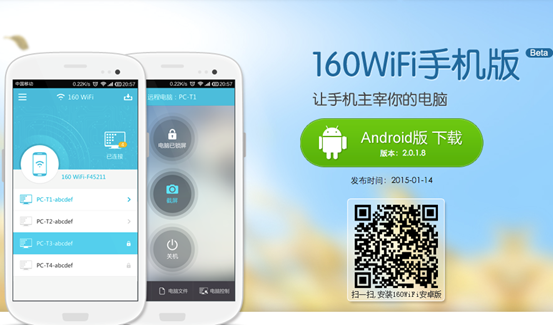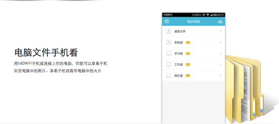 160WiFi手机版,可以连接到您的电脑,来实现共享功能,可以使用手机浏览电脑上面的图片、文件、电影等,并且可以使用手机来远程遥控您的电脑,无论是关机、锁屏还是截屏,都可以通过手机搞定,还亲自下床去关电脑?