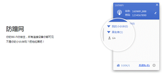 其实方法很简单,只需要在拥有无限网卡的电脑上面装上160WiFi,就能让你享受移动设备免费上网的乐趣。160WiFi可以让你的电脑变成WiFi热点,无需额外购买任何硬件,手机等移动设备即可实现无线上网。并且160WiFi使用起来也无需繁琐的设置,带有的一键开启功能,让你无需在为路由器复杂的设置而烦恼。如果您担心有贪便宜的人蹭你的网,那么160WiFi带有的防蹭网功能就会让你彻底告别这一烦恼,在160WiFi界面当中,可以了解所有连接到您WiFi的无线设备,并且可以自行设置用户名和密码,看到蹭网的人,直接拉黑,防蹭网有时候就这么简单。