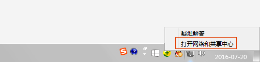 1、右键点击点击桌面右下角“网络”图标,在弹出的选项中选择“打开网络和共享中心”;