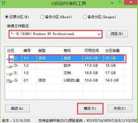 2、进入win8pe系统,在u启动pe装机工具中,将xp系统镜像文件安装在c盘中,点击确定,如图: