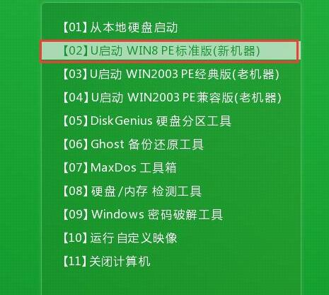 1、首先,我们先提前制作好u启动u盘启动盘,并且准备好win7系统镜像文件放在u盘中。接着把u启动盘插入电脑usb接口,按开机启动快捷键进入u启动主菜单界面,并且选择【2】u启动win8pe标准版(新机器)按回车键进入,如图所示: