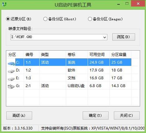 2、进入pe系统之后,在u启动pe装机工具中选择win7系统镜像安装在c盘中,点击确定,如图所示: