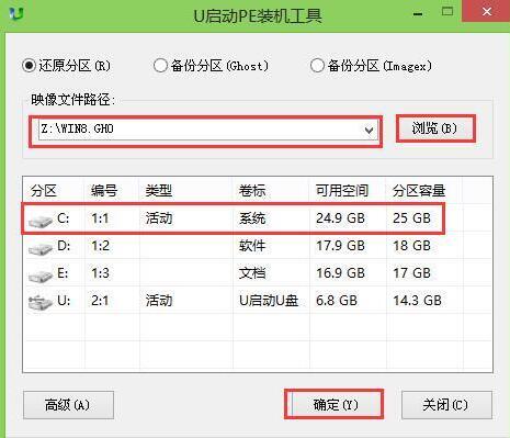 2、进入pe系统后,在u启动pe装机工具中,把win8镜像文件放在c盘中并且点击确定按钮,如图所示: