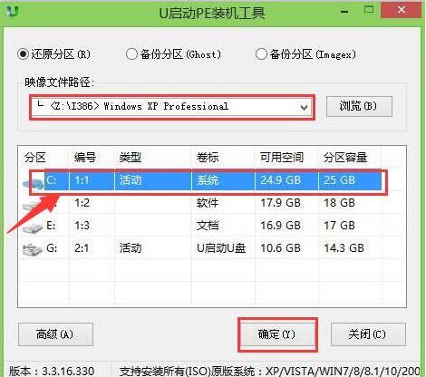 2、进入了pe系统桌面之后,系统会直接弹出u启动pe装机工具,把xp系统镜像文件安装到c盘当中,然后点击确定。如图所示: