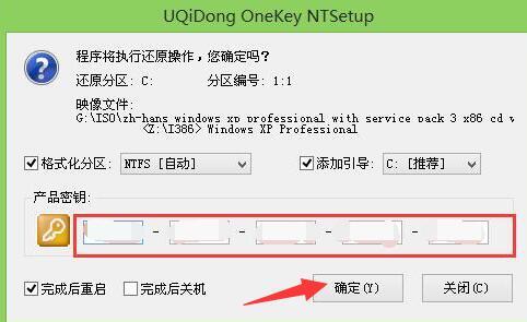 3、在弹出的程序执行还原操作提示窗口当中输入之前我们准备好的原版xp系统密钥,填写完之后再下方点击确定,如图所示: